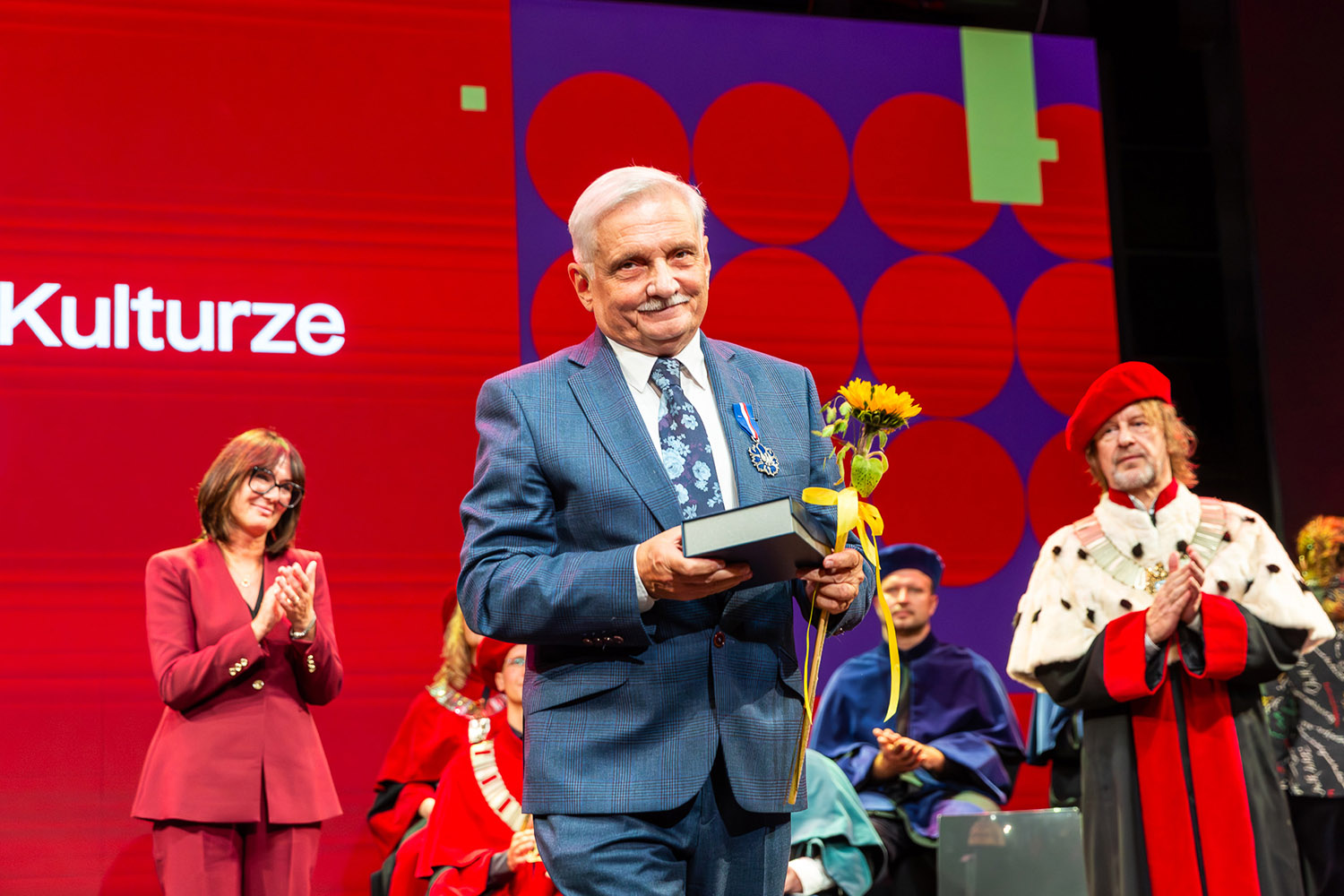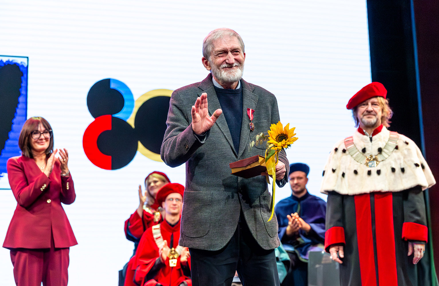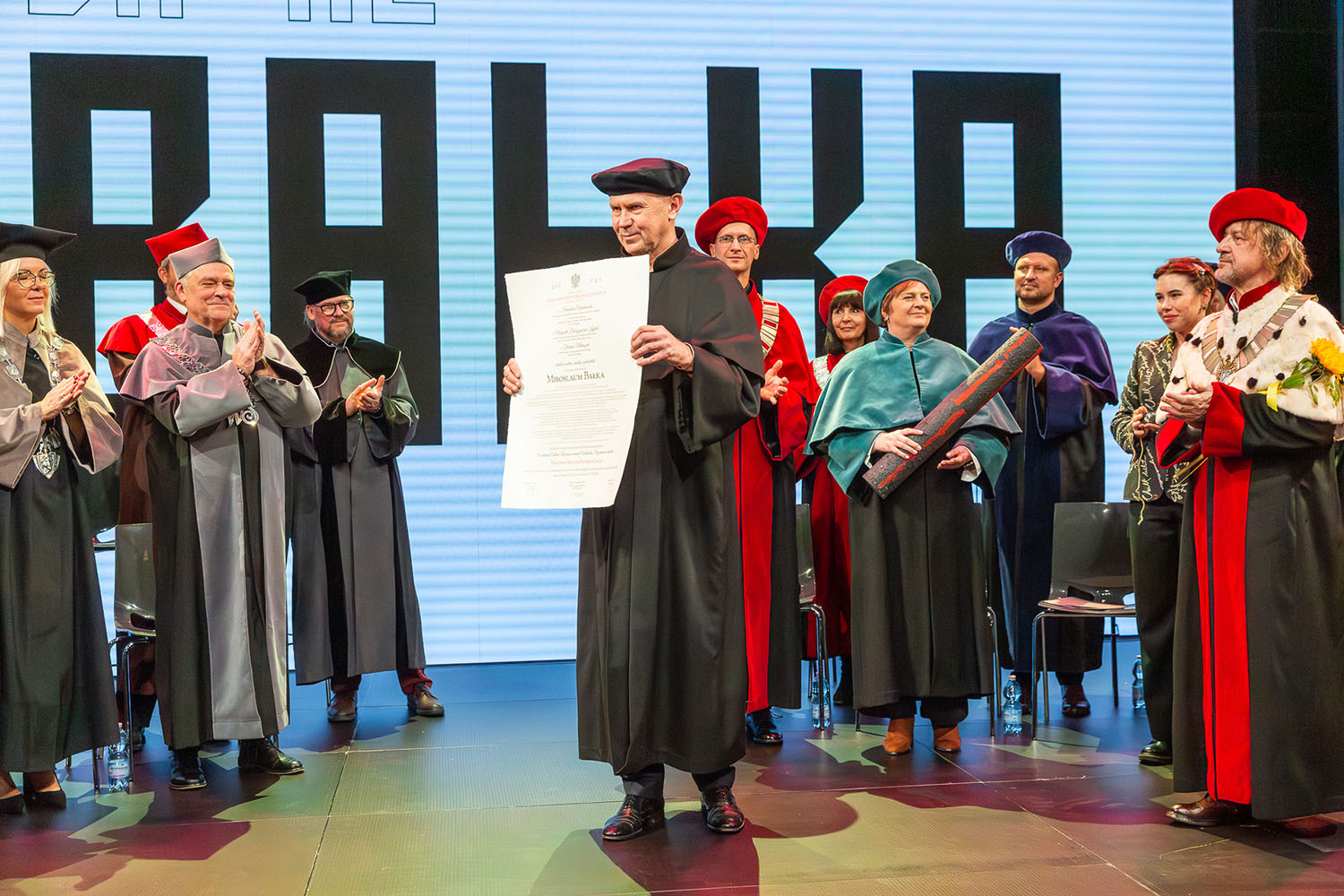 Jednym z najważniejszych momentów inauguracji było nadanie tytułu doktora honoris causa prof. Mirosławowi Bałce – wybitnemu polskiemu artyście, który dołączył do grona uhonorowanych tą godnością jako dziesiąty w historii uczelni. W wygłoszonej laudacji prof. Tomasz Matuszak podkreślił, że artysta konsekwentnie podejmuje w swojej twórczości fundamentalne tematy ludzkiego doświadczenia – ciała, pamięci, przemijania, śmierci i Zagłady – nadając im głęboki, uniwersalny wymiar.