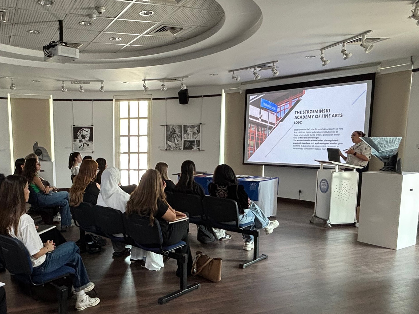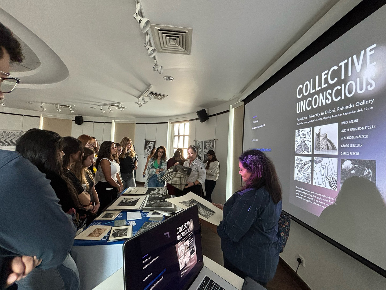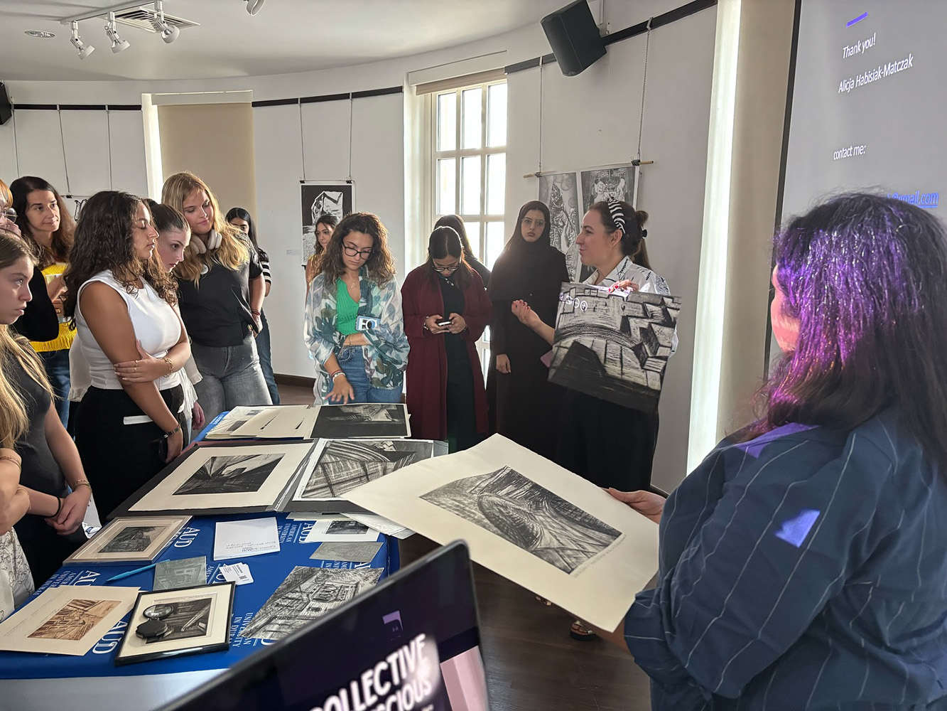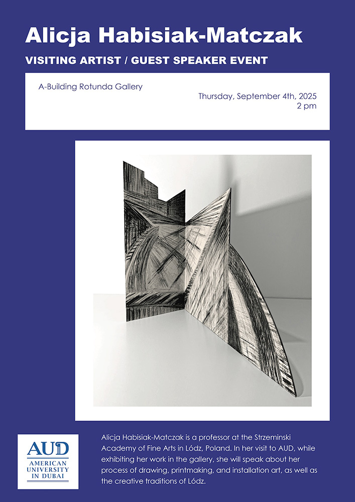 We wrześniu w Uniwersytecie Amerykańskim w Dubaju, w Zjednoczonych Emiratach Arabskich, odbył się wykład dr hab. Alicji Habisiak-Matczak, prof. uczelni. Tematem prezentacji były innowacyjne rozwiązania technologiczne i estetyczne stosowane przez artystkę w dziedzinie grafiki, rysunku i rzeźby.