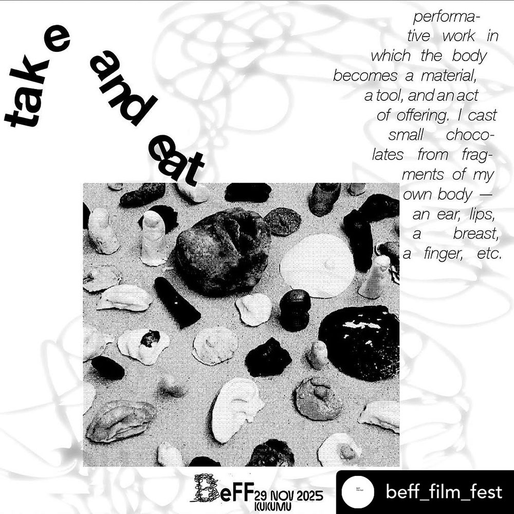 Podczas BeFF Film Fest, który odbył się 29 listopada 2025 r. w przestrzeni Kukumu w Berlinie Karolina Majewska, dokorantka Akademii Sztuk Pięknych w Łodzi, zaprezentowała performans „Take and Eat (3)” oparty na pracy z ciałem, słodkimi obiektami i aktem jedzenia jako formą intymnej wymiany między artystką a publicznością.
