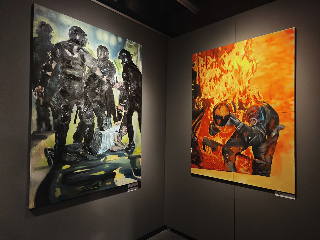 Nagrodzona praca, obraz „Argument siły VII” (olej na płótnie, 168×120 cm, 2025), inspirowana jest fotografiami ukazującymi zamieszki uliczne i oddaje dramatyczne zderzenie jednostki z aparatem władzy oraz potęgą policyjnych kordonów.