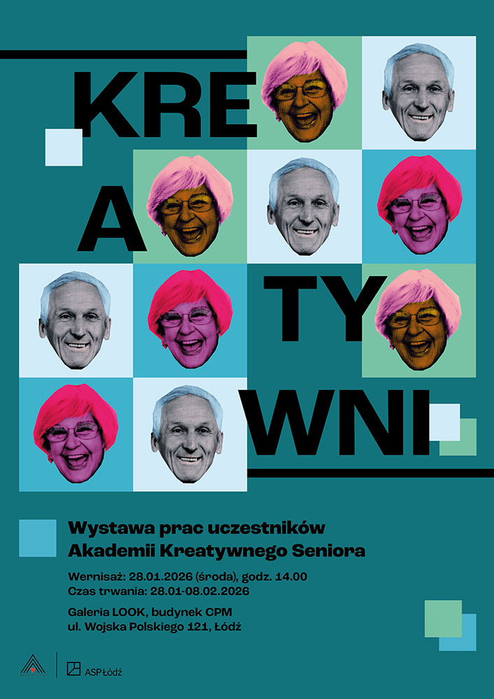Rektor Akademii Sztuk Pięknych im. Władysława Strzemińskiego w Łodzi zaprasza na otwarcie wystawy „KREATYWNI”, prezentującej prace uczestników Akademii Kreatywnego Seniora zrealizowane w roku akademickim 2025/2026. Wernisaż odbędzie się 28 stycznia 2026 r. o godz. 14.00 w Galerii LOOK Akademii Sztuk Pięknych w Łodzi.