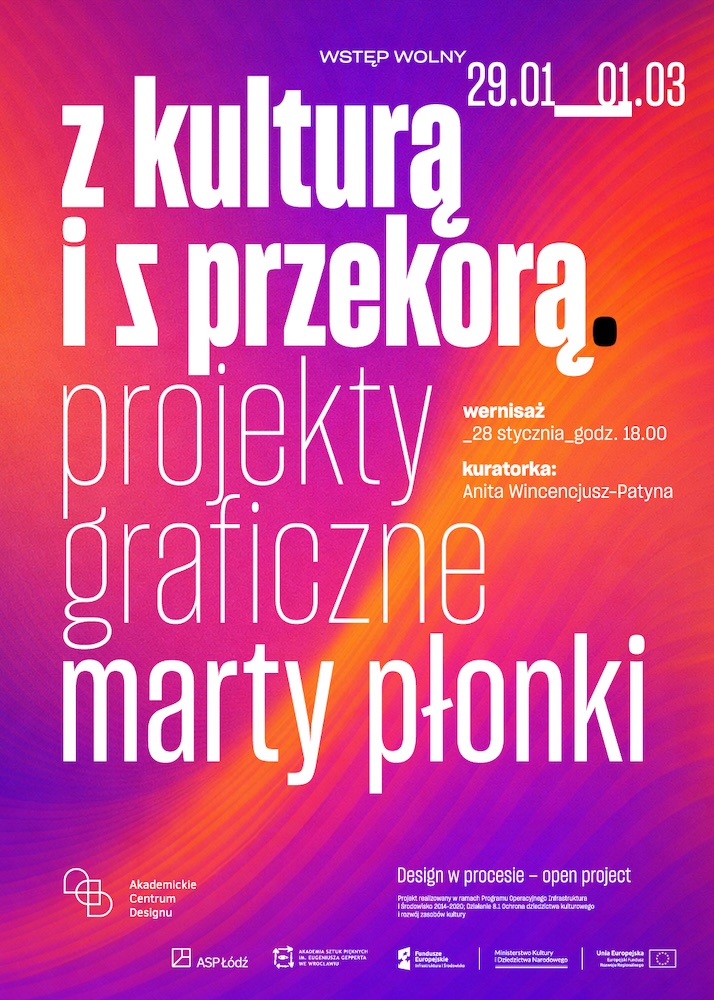 Wystawa „Z kulturą i z przekorą” w Akademickim Centrum Designu zaprezentuje 33 projekty wydawnicze i 22 plakaty zrealizowane przez Profesor Martę Płonkę, projektantkę graficzną, prorektorkę ds. naukowych i współpracy z podmiotami zewnętrznymi Akademii Sztuk Pięknych im. Eugeniusza Gepperta we Wrocławiu. Wernisaż odbędzie się 28 stycznia 2026 r. o godz. 18.00.