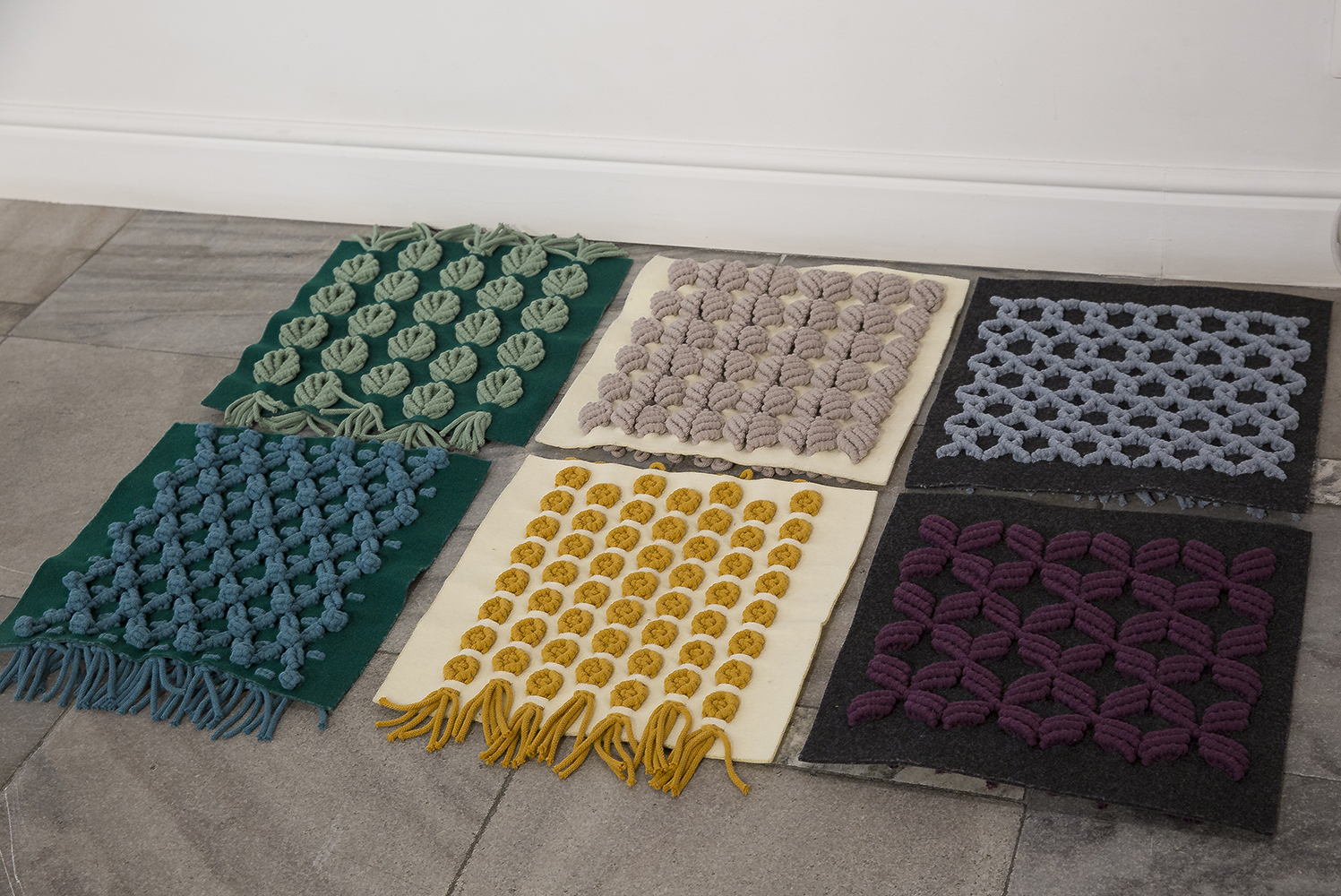 Na wystawie rządzą przeróżne techniki rękodzielnicze, bardzo chętnie eksplorowane przez studentki i studentów pracowni. Tytułowe dzierganie, tkanie, szycie trzeba poszerzyć o wiązanie, drukowanie, malowanie, stemplowanie, haftowanie, szydełkowanie, igłowanie, mieszane techniki autorskie oraz te wspomagane współczesną technologią. Swoboda realizacyjna konfrontowana jest ze znacznie bardziej zaawansowaną umiejętnością projektowania i opracowania dywanu przemysłowego, czego doskonałe przykłady również odnajdziemy na wystawie.