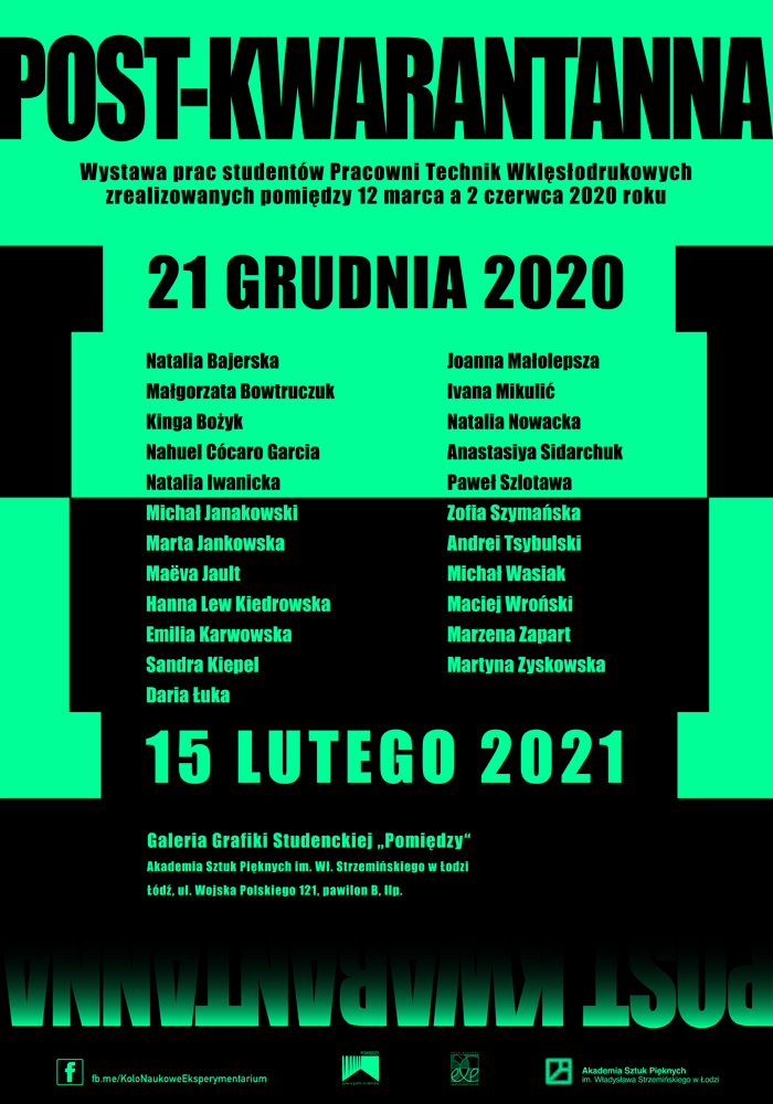 Serdecznie zapraszamy do obejrzenia wystawy „Post-Kwarantanna”, podczas której zostaną zaprezentowane prace zrealizowane przez studentów z Pracowni Technik Wklęsłodrukowych pomiędzy 12 marca a 2 czerwca 2020 roku, w okresie zamknięcia uczelni z powodu sytuacji epidemiologicznej w kraju. Wystawa jest kontynuacją wystawy „Kwarantanna”, która odbyła się w czerwcu br. online na stronie fb Koła Naukowego „Eksperymentarium”.