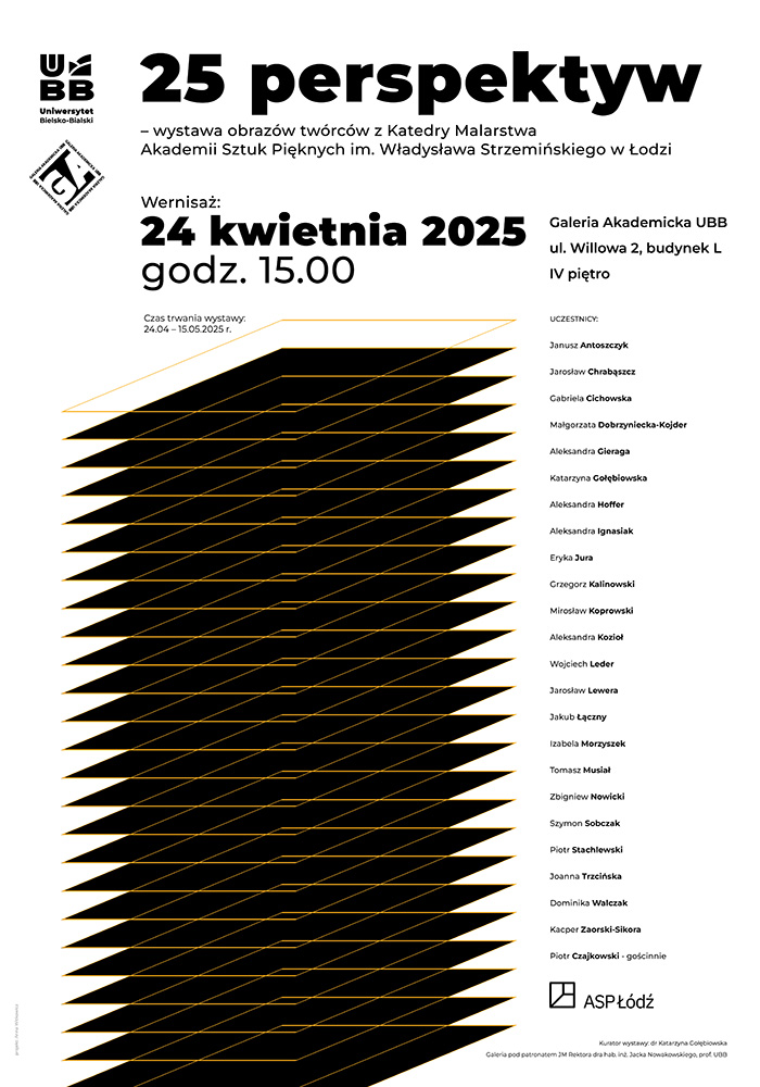 Wystawa „25 Perspektyw” to zarazem prezentacja wycinka działalności artystycznej twórców z Katedry Malarstwa Akademii Sztuk Pięknych im. Władysława Strzemińskiego w Łodzi, jak i zwrócenie uwagi na samo medium malarstwa jako nośnik różnorodnych idei i postaw artystycznych.