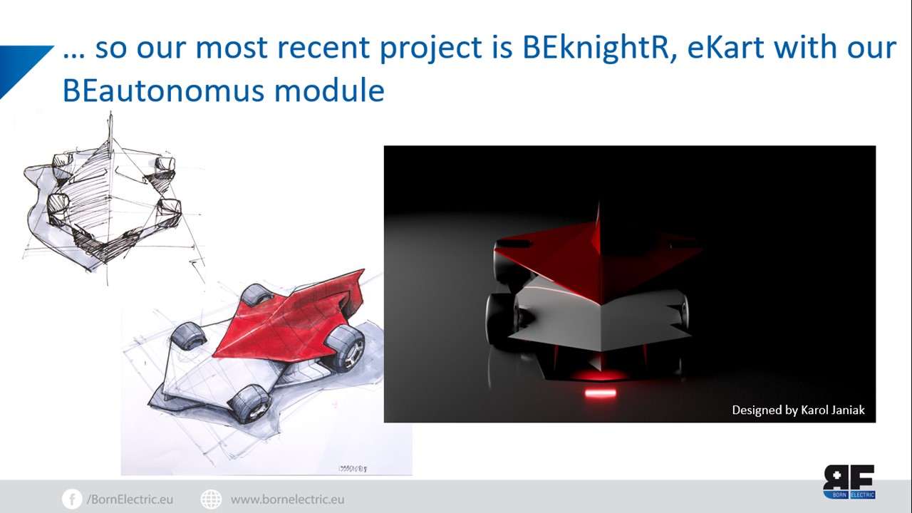 Z Akademii Sztuk Pięknych im. Władysława Strzemińskiego w Łodzi swój projekt autonomicznego bolidu elektrycznego dla firmy Born Electric sp. z o.o. mgr przedstawił Karol Janiak. Zakres prac obejmował stworzenie koncepcji poszycia dla podwozia zaprojektowanego przez firmę. Celem projektu było m.in. stworzenie ciekawej formy, która niosłaby odpowiedni ładunek semiotyczny. Ekspresyjną i dynamiczną formę uzyskano wyginając płaskie powierzchnie. Tak zbudowana karoseria umożliwiałaby łatwy serwis pojazdu i tworzyła atrakcyjną obudowę spełniającą wymagania aerodynamiczne i uwzględniała miejsca na umieszczenie czujników otoczenia.