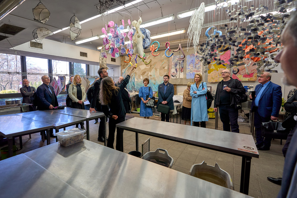 Po obradach goście mieli okazję zwiedzić wybrane pracownie Akademii. Duże wrażenie zrobiła tkalnia z zabytkowymi krosnami, warsztaty druku na tkaninie oraz Pracownia Papieru.