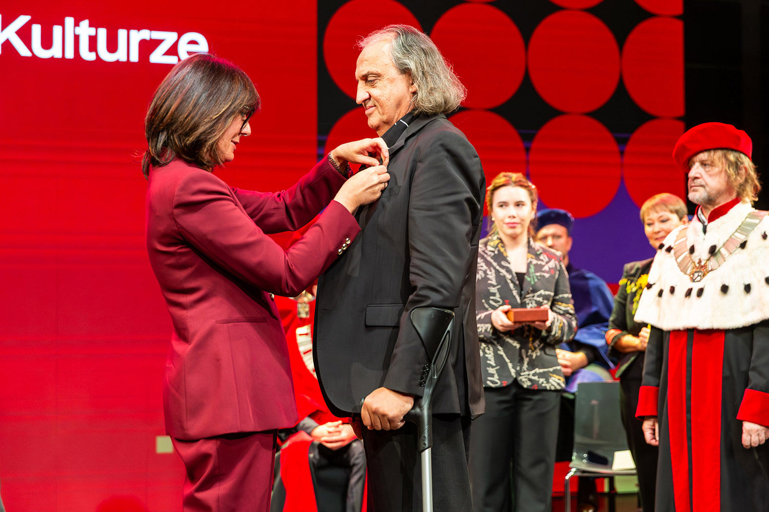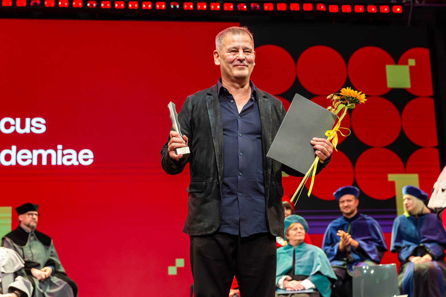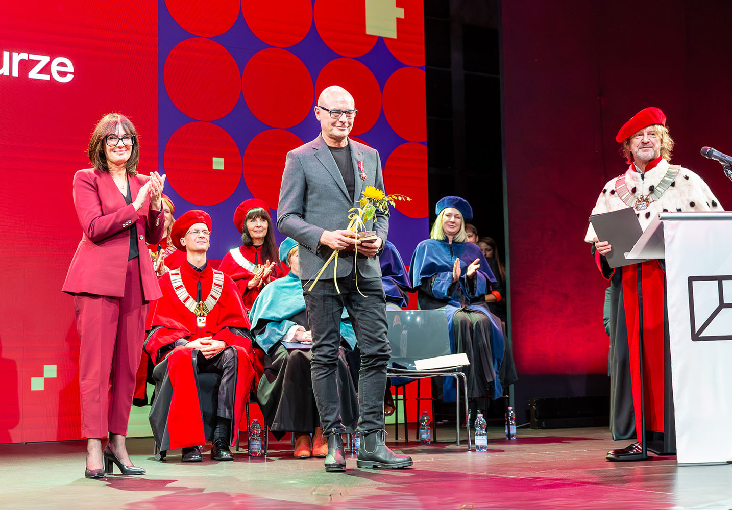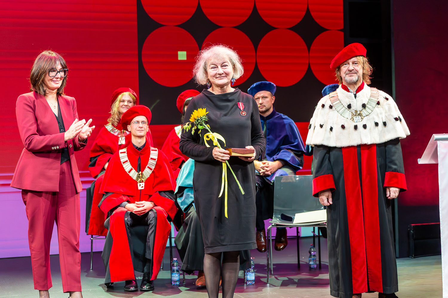 Jednym z najważniejszych momentów inauguracji było nadanie tytułu doktora honoris causa prof. Mirosławowi Bałce – wybitnemu polskiemu artyście, który dołączył do grona uhonorowanych tą godnością jako dziesiąty w historii uczelni. W wygłoszonej laudacji prof. Tomasz Matuszak podkreślił, że artysta konsekwentnie podejmuje w swojej twórczości fundamentalne tematy ludzkiego doświadczenia – ciała, pamięci, przemijania, śmierci i Zagłady – nadając im głęboki, uniwersalny wymiar.